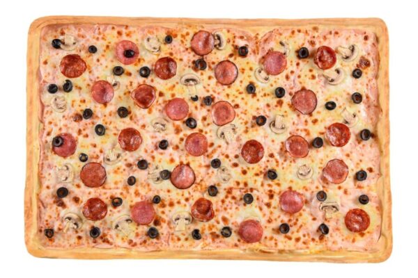 topping pizza First/mozzarella, sos de roșii, mușchi file, salam de vară, salam Chorizo, ciuperci...