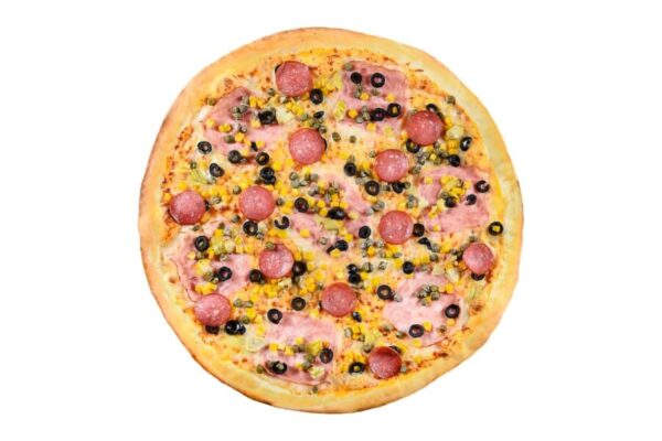 topping pizza First/mozzarella, sos de roșii, șuncă, jambon, salam bănățean, ciuperci, porumb ...