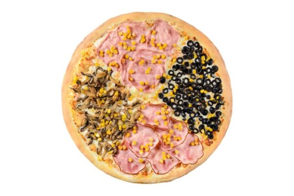 1/4 - topping pizza First/mozzarella, sos de roșii, șuncă, porumb, măsline 1/4 - topping piz...