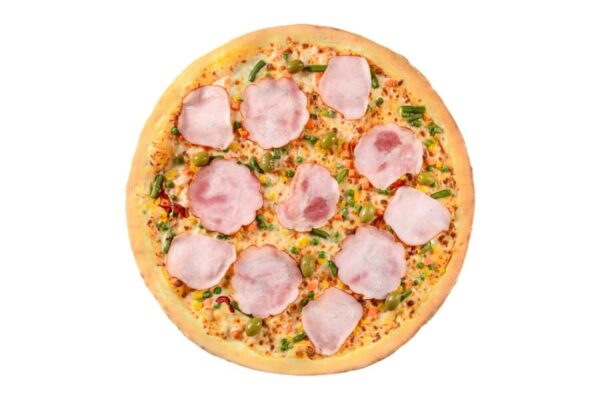 topping pizza First/mozzarella, sos de roșii, șuncă, telemea, specialitate bacon, măsline negre ...