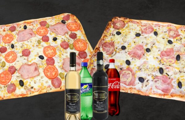 - 1 Party Margherita - 1 Party Carnivora - 1 sticlă de vin alb - Premiat - 1 sticlă de vi...