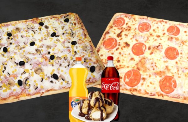 - 1 Party Multipizza - 1 Party Carnivora - 2 Coca-Cola la 1l - 1 porție de Profiterol